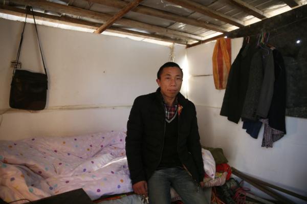 用模板搭建的简易工棚里,虽盖着两床被子,但从工棚顶、门缝及从模板墙洞钻进的冷风还是会把他冻醒。买不起电暖器,也舍不得买电热毯,石纪斌就把灯泡和电线移到了离枕头很近的桌旁。