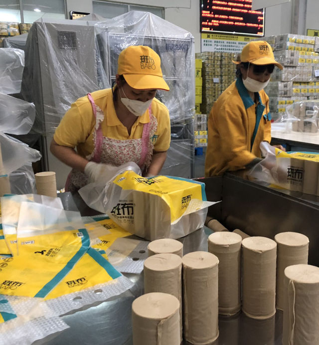 在青神县环龙新材料有限公司,工人正在为竹纤维提取制成的”斑布”纸进行包装。新华社记者陈地 摄