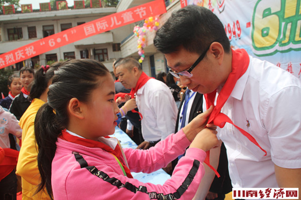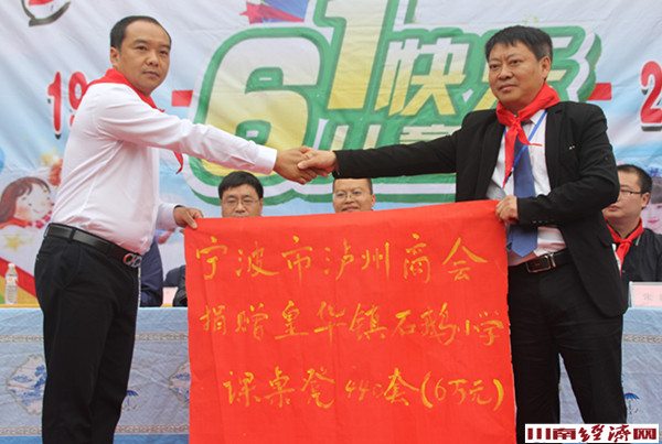 六一儿童节庆祝大会上,分别举行了升旗仪式和宣誓仪式,少先队员为参会嘉宾佩戴了红领巾。宁波市泸州商会向石鹅小学捐赠价值6万余元的新课桌椅440套。甘立祥副主席发表致辞,并向石鹅小学的同学们带去了节日的祝贺,他表示,泸商企业家一直具有扶危济困、乐善好施的传统美德,泸州市工商联、泸州市总商会也一直在推动全体泸商勇于承担社会责任和义务。希望同学们在爱心企业家的帮助下,在日趋改善的学习环境下好好学习,奋发向上,成长为社会的栋梁之才。