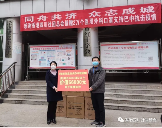 疫情就是命令。總會成立伊始,會務發展百事待興,任重道遠。但在港四川人沒有遲疑,沒有觀望,我們一直在行動,總會首長將抗疫當做頭等大事,馬不停歇的成功從國內外訂購到口罩幾十萬個,首批30萬個正陸續交貨。為發揚四川人團結互助的精神,其中主要捐給四川有關地市和本港鄉親,目前已經通過香港中聯辦社聯部定向捐贈給香港社區市民及在港四川鄉親3.8萬個;四川省瀘州市10萬個、巴中市2萬個、南充市2萬個、廣西蒼梧縣1萬個都已捐贈到位;還特別捐給疫情最嚴重的湖北省3萬個,包括隨州市2萬個、港資武漢亞心總醫院1萬個。捐贈瀘州的10萬個口罩是由常務副會長吳世其代表總會捐贈,由其公司景宏實業集團生產捐獻。2月28日,捐贈儀式在瀘州市委統戰部舉行,瀘州市委統戰部常務副部長韓俊平、市僑聯專職副主席羅華出席捐贈儀式。