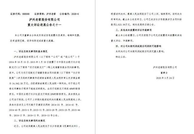 2019年5月17日,泸州老窖发布公告称,收到长沙存款案一审《民事判决书》。判决书称,对于泸州老窖通过刑事执行程序不能追回的损失,由农行迎新支行承担40%的赔偿责任,中国农业银行长沙红星支行承担20%的赔偿责任,其余损失由泸州老窖自行承担。