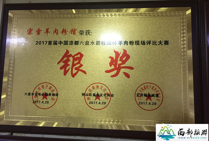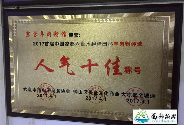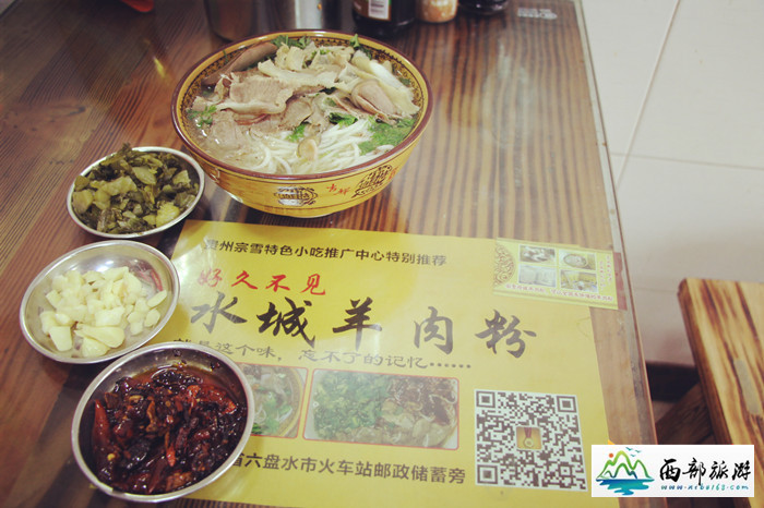 西部旅游网10月22日贵州.六盘水讯(本网记者:李昌宏)水城羊肉粉起源于上个世纪八十年代初,是今贵州省六盘水市的民间小吃,早餐主食。水城羊肉粉及“宗雪荷城羊肉粉馆”是六盘水众多羊肉粉店面之一,坐落于贵州省六盘水市钟山区水西路火车站进站口(邮政银行旁),由80后的年轻老板邓宗雪于2006年注册开设并经营。