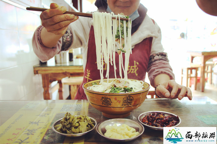 邓宗雪向记者介绍说:羊肉粉的辣椒是自家研制的独门秘方,坚决不外传;清汤羊肉,未添加任何调味剂,保留着羊肉本身的鲜味。滚烫的羊肉汤,火辣辣的油辣椒,细腻的肉片,再配以白玉般的米线,一碗羊肉粉香辣糯软,直叫吃粉人一身大汗淋漓,意犹未尽。