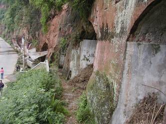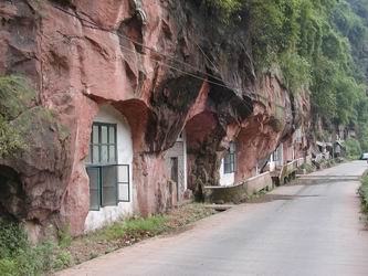车过花贝溪大桥,沿鼓儿石顺盘山公路道慢行,行约一公里左右,眼前被前人神工鬼斧、开山凿洞构筑的奇观迷住了,这就是"十二洞天",也叫化学兵仓库。