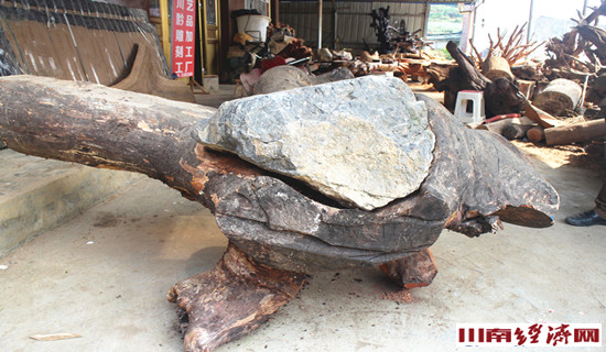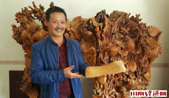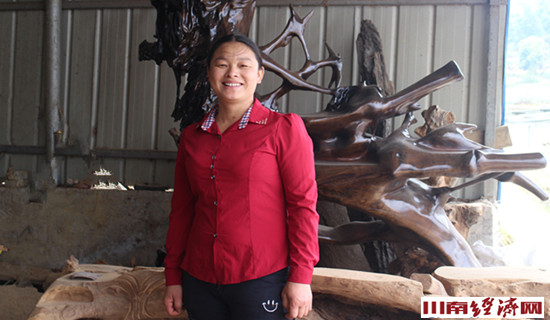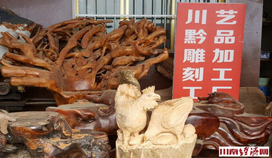 他想,福建多个地方,许多人搞根雕能赚大钱,我为啥就不能?说干便干,2015年的春天,夫妻二人有了这个想法后,就带着一双儿女动身回家,来到老家古蔺的水口镇街村,利用自己的房子和当地树桩资源,成立了自己的川黔工艺雕刻品厂。王堂灿找来曾经的锯子、斧子和凿子,买回刻刀,开始了创业。他们托朋友,找亲戚,从周边买来树根树桩,妻子还是老本行,负责初加工,王堂灿负责打磨过细,一段时间,院子里的树桩树兜变成了鸟类花草的造形,根雕这门传统的民间艺术,在他们的手里成为艺苑里古色古香的一支奇葩。