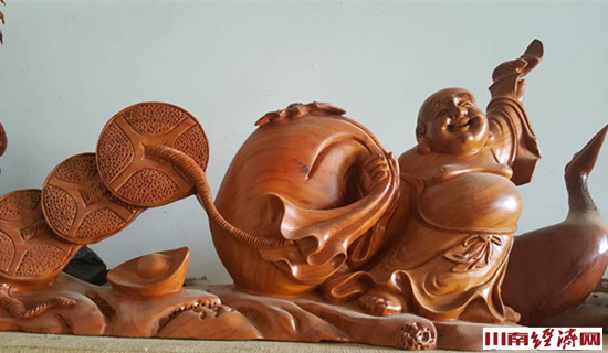那年端午节,一位耄耋老人来到王堂灿家中,自我介绍是贵州仁怀人,看了他的根雕作品,开口便问其中一个《双龙戏珠》作品卖多少钱,他开出的价格是2万元,那位老者没有跟他过长时间的讨价还价,落到1.5万元上,就爽快地掏钱买走了他整整用了三个月工夫才雕成的那件作品。这是他们回乡创业卖出的第一件作品,夫妻二人欣喜若狂,一家人也为此沉浸在喜悦之中。事实证明他的回乡创业之路走对了,那个虚无缥缈的发财梦也终于变成了现实。