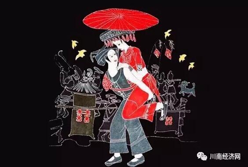 一座座码头红红的油纸伞,一对青年男女在伞下深情呓语。