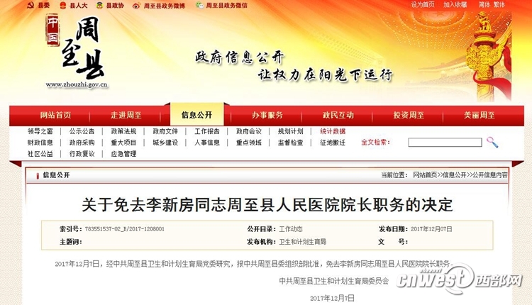 西部网讯(记者刘望) 今天(12月7日),周至县政府网站刊发中共周至县卫生和计划生育局委员会的消息称,经中共周至县卫生和计划生育局党委研究,报中共周至县委组织部批准,免去李新房同志周至县人民医院院长职务。