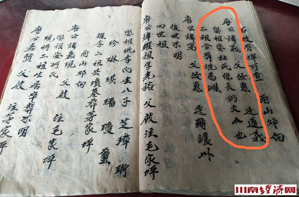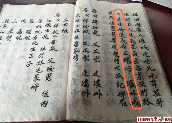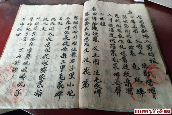现存于古蔺丹桂唐氏族中的1947年版唐氏族谱(手抄本),族谱记载与碑文记载相符。翻开唐氏族谱,这样记述唐家湖广入川历史:自湖广鄱阳入蜀始祖。唐公讳正用,父顺之。注鄱阳湖,娶祖妣陶氏生汝惠、尧、旺。俸。惠祖因湖麻作乱,保属避叛弃湖,入川徒泸迁坎落业毛家坪墓葬。