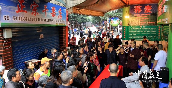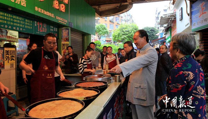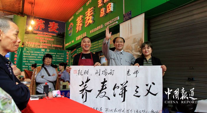 中国报道讯(记者李博 通讯员任鸿)今日(3月18日),毛主席第三代特型演员缪世璇、四川宜宾江安县摄影家协会副主席任鸿、江安县民间艺术家协会副主席及蜀南竹海楠月湾休闲山庄董事长张建平、重庆电视台《老根书画院》院长张西平及江安在江津的老乡会会长冯立彬一行来到了重庆市江津区四不挨荞麦芝麻饼总店看望在江津创业13年的江安人-----刘瑞雨。
