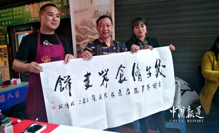 缪世璇、任鸿现场先后为荞麦芝麻饼总店挥毫泼墨为刘瑞雨送上鼓励和祝福,希望他在江津越做越好、越做越大。在现场不少闻名而来的群众都一一和缪世璇合影留念。