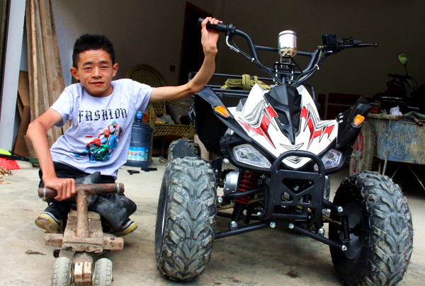 双沙万寿村一组的高强,今年25岁,四五岁的时候从高空坠落,造成双下肢萎缩,从此,注定了他的爬行人生。他没有上过一天学,每月靠政府的低保和残疾补助,以及哥嫂的资助过日子。他靠电视和手机帮助,认识了许多字。每次出行,他只能用轮胎皮包好下肢,手脚并用,靠一个自制的滚珠车出行,雨天一身泥水,热天一身灰尘,路人老远看见他那瘦小的身体,只能同情地叹气。今年,古蔺高乐公司的扶贫车间开进高强家,也开进他曾经自卑的世界。他利用业余时间,完成了公司要求完成的扣件任务,月工资达1600多元,收入在过去的基础上翻了四五倍。不到两个月的时间,他用自己的工资买来了电动摩托,大大扩展了自己的出行半径。从手动滚珠车到电动摩托,是一种“鸟枪换炮”的高调,也是高强自我人生价值的展现。他说,没有高乐公司的扶贫情怀,我的人生终将永远爬行。
