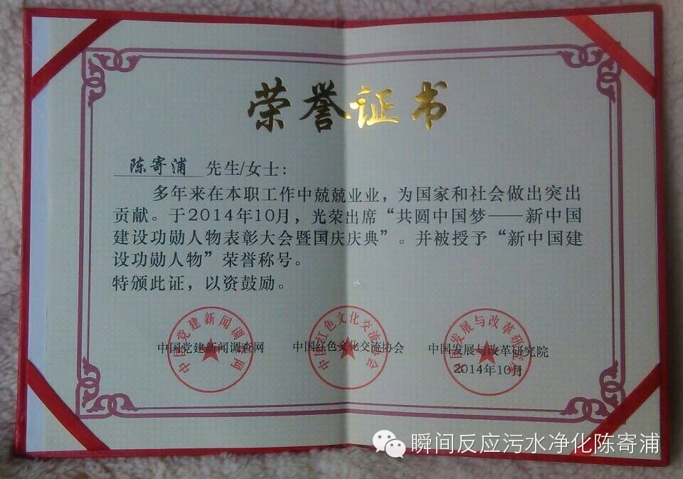 这是怎么回事呢?事情要追溯到一个月多前。2014年9月29日-10月1日,由中国党建新闻调查网、中国红色文化交流协会、中国发展与改革研究院主办的“共圆中国梦、新中国建设功勋人物表彰大会暨国庆庆典”活动,在北京隆重举办了系列活动,陈寄浦先生作为新中国建设功勋人物,本应走上红地毯,登上庄重的颁奖盛典领取证书和勋章,为什么现在才从北京邮寄获得呢?