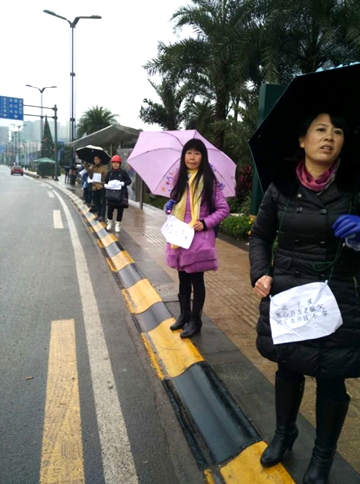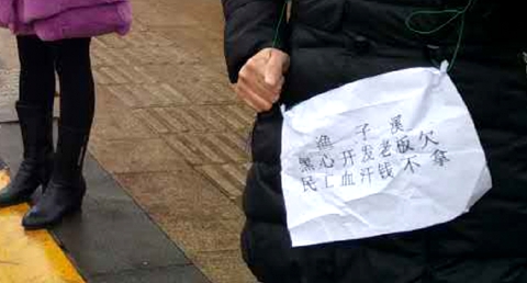 1月9日上午,在碧桂园生态城的车站旁,来了很多农工,他们表示辛辛苦苦在工地干了一年多,没等来工钱,现在已没办法回家了。他们身上挂着牌子,在大雨中现场静默站立,以文明、理性的方式表达诉求,希望渔子溪的黑心开发商老板尽快发放工人工资,让他们能安心过个年。