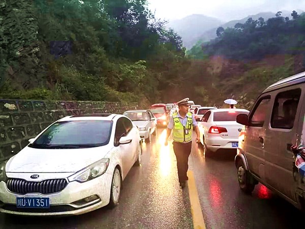 2018年8月16日,又是叠溪,洪水冲塌道路,泥石流冲垮桥梁。213国道又成了一个巨大的城露天停车场,数千辆车被拦下,成了山上飞石的靶子。电闪雷鸣,乱石腾飞中,交警大队与邻近几个派出所好男儿第一时间冲上战场。十万火急将危险中的车辆疏散到安全区域,又设置警戒,配合公路局抢险疏通道路。两天两夜,他们吃住都在现场。期间,至少有5个弟兄与死神擦肩而过——山上滚落的巨石就从他们身边飞过。交警大队副大队长余和敬回忆这一段经历时,脸上甚至还有一种后怕。他说,弟兄们都是血性汉子,别看平时也会说几句闲话发牢骚。但一到危险关头,没一个喊黄,都敢拿命来拼。可能那就是深入到弟兄们血液中的职业本能吧,当时一心想的就是争分夺秒把人员车辆转移到安全地带。至于自己的安全,根本没功夫考虑。仿佛只有别人才不安全,自己则有天神佑护,是金钢不坏之身。余和敬是羌族汉子,他居然打趣地说,“我们羌族老人们常说,山上的飞石不打好人。”不过,他又补充,第一次出事是自然灾害,但如果出现第二次车辆损毁与人员伤亡,那就是我们的责任。