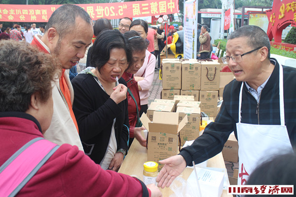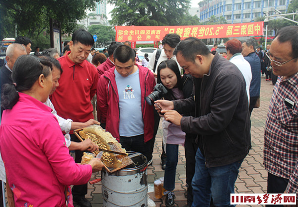 古蔺县北纬二十八度蜜蜂养殖专业合作社负责人陈兵向市民介绍蜂蜜鉴辨方法