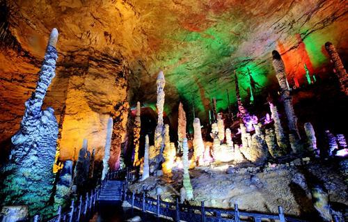 黄龙洞位于索溪峪自然保护区东部。洞内分旱洞和水洞,共四层,最大洞厅面积12000㎡,可容纳上万人。