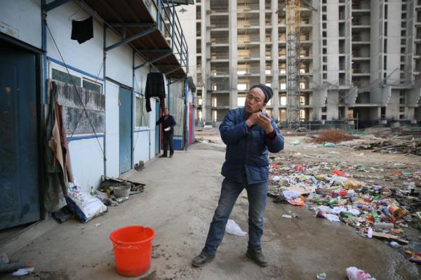 一名工人在院子外,用冷水洗脸剃胡须。澎湃新闻记者谢匡时图