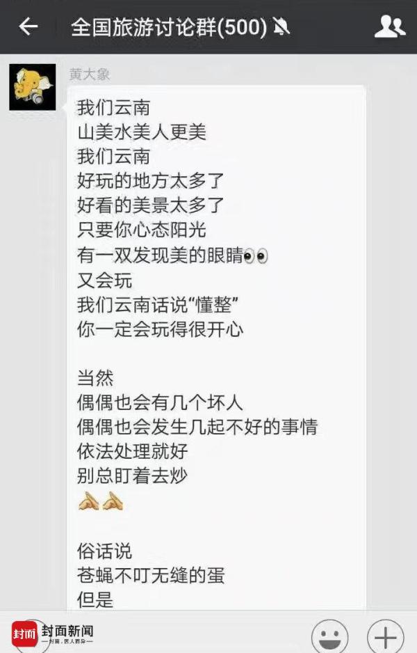 2017年2月16日,云南省旅游发展委员会干部黄林武(微信昵称:黄大象),在“全国旅游讨论群”微信群中发表个人言论,引起了媒体和公众热议。云南省旅游发展委员会已关注到相关舆论。对此,声明如下: