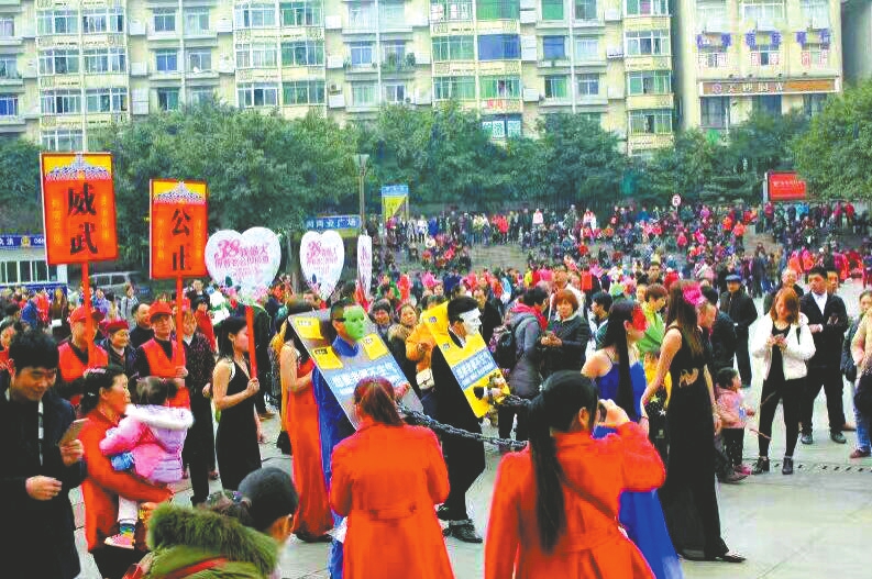 两名戴着面具的男子,蹲在医院内的护士站前,戴着枷锁,双手被拴上铁链。铁链的另一头,分别攥在两位戴着面具的女士手中,两位女士站着。这几个人的后面,有人举着写有“公正”、“威武”以及“38我最大,押着老公做检查”字样的广告牌。