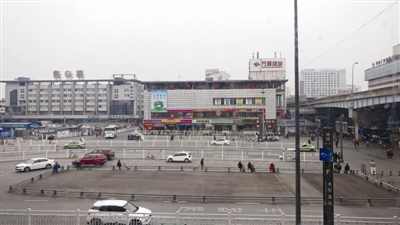 成都火车站广场前车辆下客处,有人带着拖车伺机揽拉行李的生意
